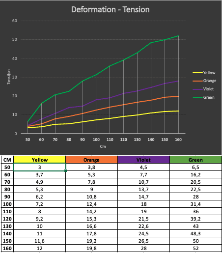 Figure 4 Force generated by different bands of different colours at different lengths measured by a force cell. For example, the violet band generates 13,7 kgF when it´s length is 80 cm (unpublished data).