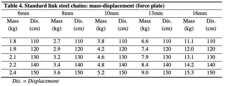 Figure 5 Table showing the relationship between mass and distance for chains of different diameters12.