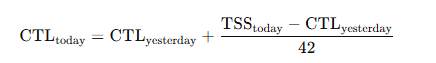 CTL is derived from Training Stress Score (TSS), a value that quantifies each session based on intensity and duration. The classic formula used in platforms like TrainingPeaks is: