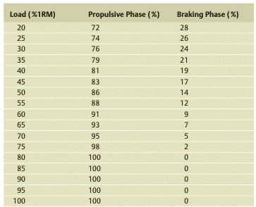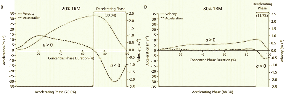 In most resistance exercises, movement starts from zero velocity, achieves peak velocity at some intermediate time within the concentric portion of the lift and, finally, returns again to zero velocity. Thus, a considerable portion of the concentric phase is devoted to decelerate the load, especially with light (<50/60%1RM) and medium loads (60-75/80% 1RM) 8. This negative acceleration (deceleration) appears to be greater than what would be expected due solely to the effect of gravity and it´s due to the athlete´s force applied in the opposite direction of the motion. As a result, the force applied by the athlete against the external load is negative and from a kinematic point of view the movement can be further subdivided into a ‘ propulsive ’ ( F > 0) and a ‘ braking ’ ( F < 0) phase8.