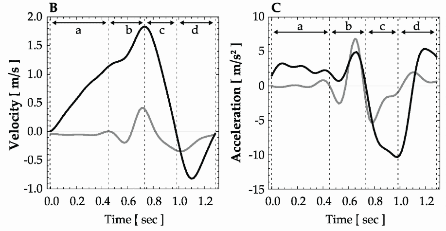 Figure 3 -Vertical (Black line) and Horizontal (Grey line) Velocity and acceleration profile of a Snatch. a) 1st Pull; b) 2nd Pull; c) turnover phase; d) Catching Phase. Peak vertical velocity occurs at the end of the 2nd Pull when acceleration is near 0; during turnover phase velocity and acceleration decreases14.