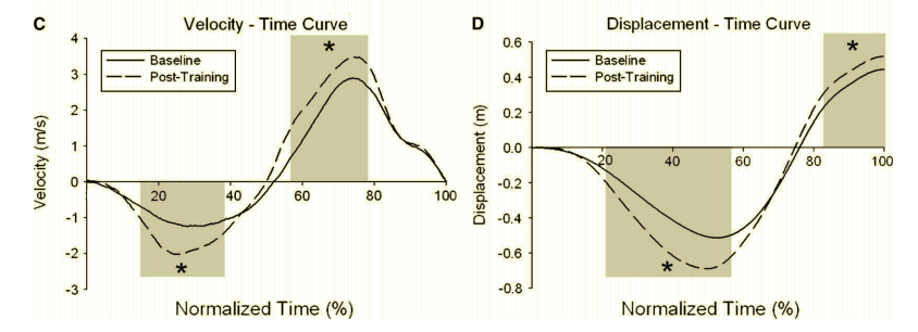 Figure 4 – Pre and post 12-week power-oriented training intervention on the velocity/time curve and displacement/time curve15