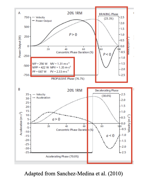 To summarize the paper of Sanchez-Medina (2010), when lifting light and moderate loads, there exists a final phase during which deceleration is of greater magnitude than would be expected solely due to the effect of gravity. This is the result of the athlete applying force in the opposite direction of the load’s movement.