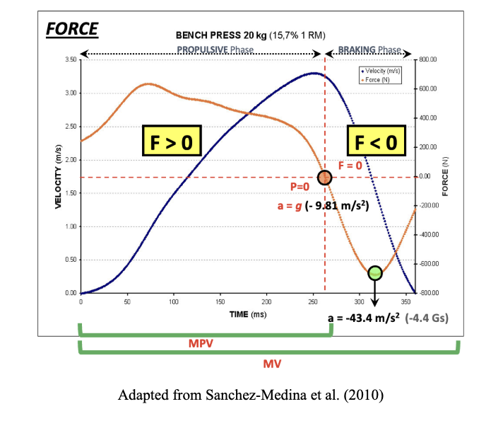 The findings of the study by Sanchez-Medina et al. (2010) indicate that referring mean velocity values exclusively to the propulsive phase (MPV) when evaluating the velocity and power with which a load is lifted during a concentric action avoids underestimating an individual’s neuromuscular capacity, particularly when lifting light and moderate loads. In this sense, the propulsive phase is defined as the portion of the concentric phase during which acceleration (a) exceeds gravitational acceleration (i.e., a ≥ -9.81 m∙s⁻²). To understand these conclusions more clearly and practically, let us observe the following figures: