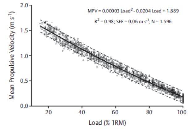 The force-speed profile, defined by the% of RM or load that we are using, and the speed at which we move it, could be defined for each subject on the bench press, and later it was also discovered that there is a very similar relationship in the squat and inverted rowing exercises (Sánchez-Medina, Pallarés, Pérez, Morán-Navarro, & González-Badillo, 2017; Sánchez-Moreno, Rodríguez-Rosell, Pareja-Blanco, Mora-Custodio, & González-Badillo, 2017 ). Therefore, if we knew the speed of the bar, we could know what % of the RM the person was using, and if we know their force-velocity profile (since not all people move a % of the RM at the same speed), the maximum weight that person can do in a specific exercise. A new paradigm was born.