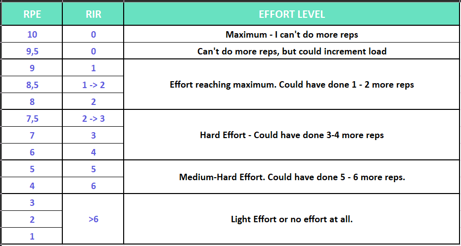In training prescription, we’ve got some subjective effort scales like the Rate of Perceived Exertion (RPE) and Reps in Reserve (RIR). These tools help figure out how hard an exercise really is for an athlete. RPE was originally meant for tracking aerobic workouts, but now it’s used in strength training too (Borg, 1970). RPE uses ratings from 1 to 10, where 1 is super easy, and 10 is as tough as it gets (Yamauchi, 2013). You can use the RPE scale for the whole session or rate each set individually. But there are some limitations and inaccuracies when it comes to measuring the true effort (Hackett et al., 2012).