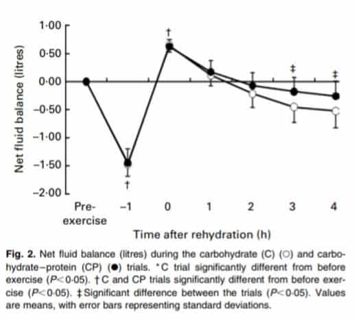 One of the conclusions of the study is “While drinking a sufficient volume of fluid to replace that lost through sweating is vital to the overall rehydration process, it is the composition of the ingested fluid that determines how much of the fluid is retained.” There are more studies that reinforce the idea that dairy proteins such as whey protein or milk improve the post-exercise rehydration process.