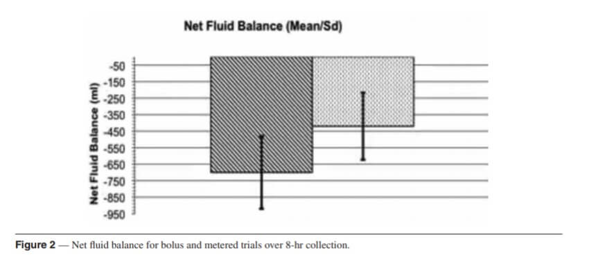 But we have a study similar to Jones (9), which compares two dosing regimens: one is equivalent to 100% of the fluid lost during the intervention (as shown in the James study) in one hour, and the other This is equivalent to the group dividing 100% of the lost fluid into 12.5% intake every 30 minutes for 4 hours. As a result, the group that consumed fluids allocated for more than 4 hours hydrated better after exercise.
