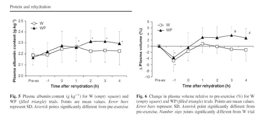 The image of study (10) shows that athletes who consume a solution containing whey protein + carbohydrates have a better water balance compared to athletes who consume only carbohydrates