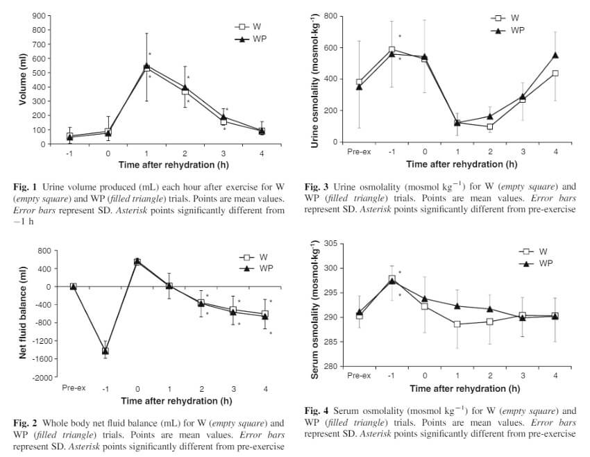 Although, as we can see in the graph below, there is no significant difference at 4 hours, this may be due to the participants’ rapid rehydration (150% of the fluid volume lost within 1 hour of intake).