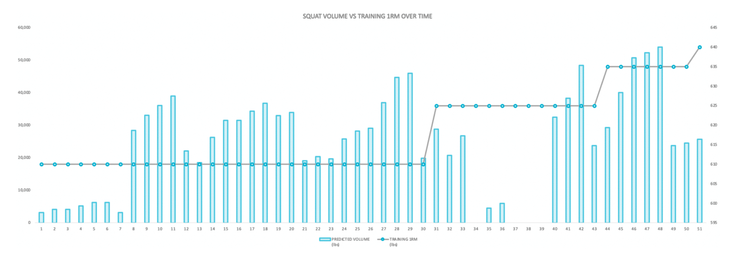 How a coach chooses to document performance doesn’t have to be fancy. We store this information in a simple Excel table, with each section corresponding to the same row as the training data from that week.A second tip that can improve a coach’s program’s quality is to start measuring and comparing your training interventions against the primary performance variable. For data-based decisions to occur, I think that a descriptive metric of the plan (i.e., training volume, training intensity, training frequency) and a performance variable (i.e., e1RM) should be tracked, compared, and visualized together. This form of analysis can highlight the correlation or lack thereof between the training workload and the outcome.Take a look at the correlation between weekly volume (Y-Axis on the left) and e1RM (Y-Axis on the right) of IPF World Champion & Best Lifter Taylor Atwood. Taylor won his 2nd World Championship and first Best Lifter award during Week 33 of this training year. We (his coaching team) can see a link between the high volume and tapering period from Week 27-30 and the increase in e1RM made in Week 30. What inferences did we make from this? The amount of volume that we performed at a high intensity near the competition helped him to progress.Another example within this same graph is in Weeks 40-48. Following the World Championship, we allowed Taylor to enjoy a vacation without the stressors of training. We quickly had to increase the training load again to prepare for Raw Nationals in Week 51. Using a similar approach to what had worked in preparation for the IPF World Championship months before, we saw Taylor’s performance increase to new heights. This all-time high level of training volume and intensity also exposed a weakness in the hips’ stabilizing muscles, which led to an injury sustained two weeks out from the competition. The load management inferences that we made from this are that the increase in loading may have been too much, too soon. Moving forward, we decided that similar increases in loading ought to be preceded by a lower intensity and higher volume period of training. This preparatory training period could improve load tolerance and work capacity and tap into the possible protective effect of maintaining a high chronic training load.