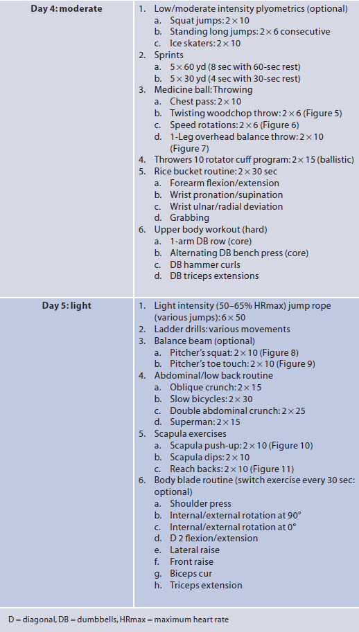 Baseball features a rotational pattern that doesn’t exist to the same extent as other sports. That’s why we should perform rotational exercises to ensure that lower body strength transfers to the upper body for faster pitching or hitting, but also more effective changes of direction. The last important group of exercises for upper body training in baseball will make use of balls and bats of different weights with which we work specifically on baseball gestures. The following table shows an example of a five-day program focused on rotation work for a pitcher (Szymanski, 2007)
