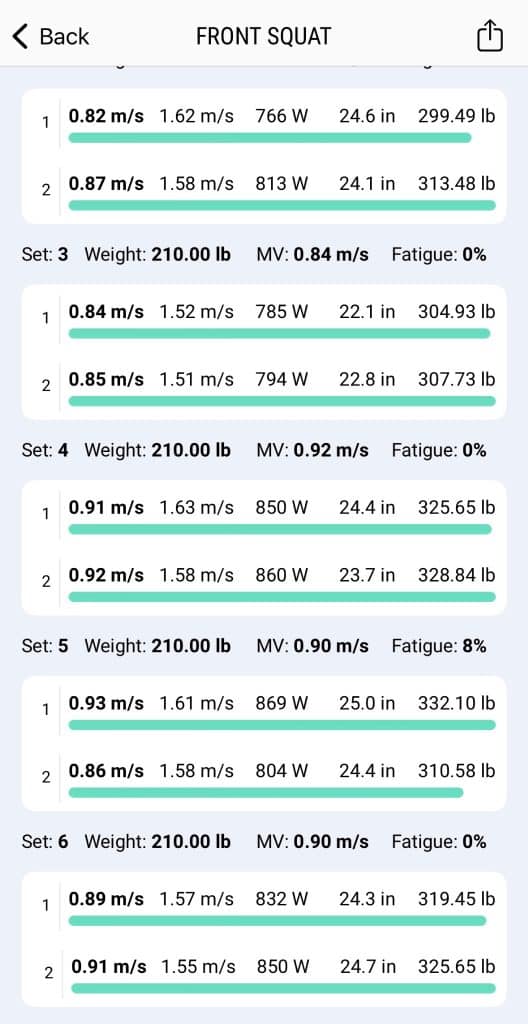 The following week we go to do our dynamic front squats and the data shows us what we see in the picture above. The speed we move the last few sets gives us a reading of an estimate closer to 325-335lbs. This information alone could help us make the assumption that we want to base our week 2, 5 rep lifts on this new estimated max instead of 315lbs. This would change our working set of 5 to either 275lbs or 280lbs. Better yet, we can use our encoder during our warm-up sets and see our performance on those heavier warm-up sets to zone in even MORE on whether we have to go up or down slightly on this top set. You can ensure you almost NEVER miss a set again with this information!