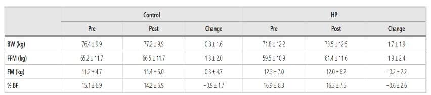 Cambios en la composición corporal entre los sujetos de control y los que llevaron una dieta alta en proteína (HP) en el estudio de José Antonio y colaboradores.