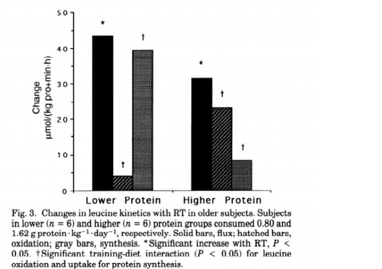Figura del estudio de Campbell et al. 1995 donde utilizando el parámetro de la leucina (aminoácido “activador” de la síntesis proteica) se aprecia la compensación metabólica realizada por los sujetos con la dieta más baja en proteína.