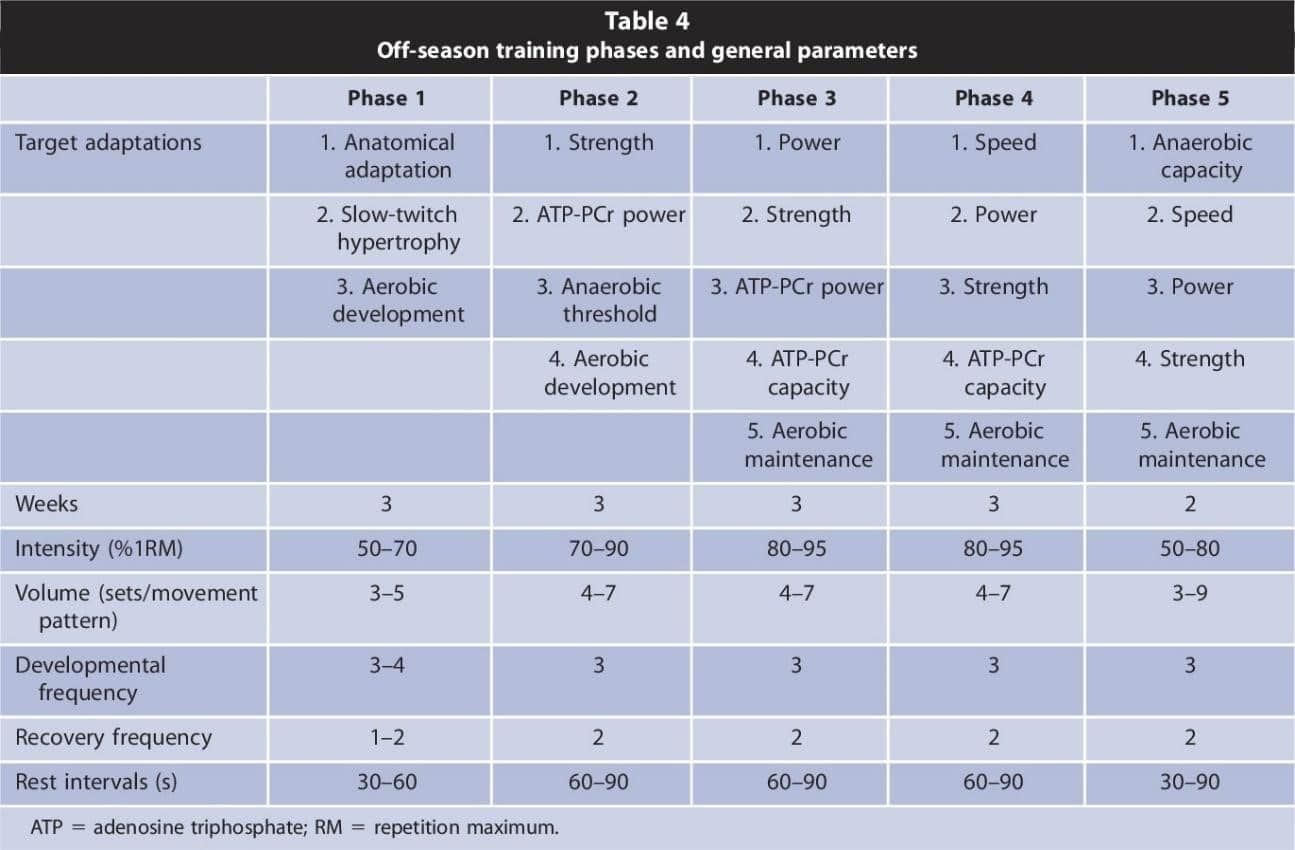 El autor Kevin Neeld, en su artículo ‘Preparándose para las demandas del hockey profesional’ propone un ejemplo de entrenamiento de fuerza y acondicionamiento para hockey en pretemporada de cinco fases y un total de 14 semanas(Neeld, 2018). En la siguiente tabla (tabla 4) se hace un resumen de las adaptaciones buscadas en cada una de las cinco fases, así como las variables utilizadas en cada una de ellas.