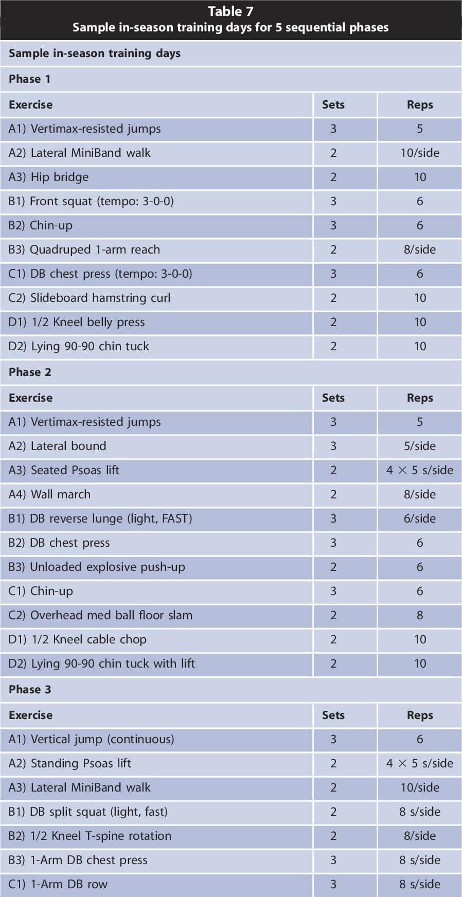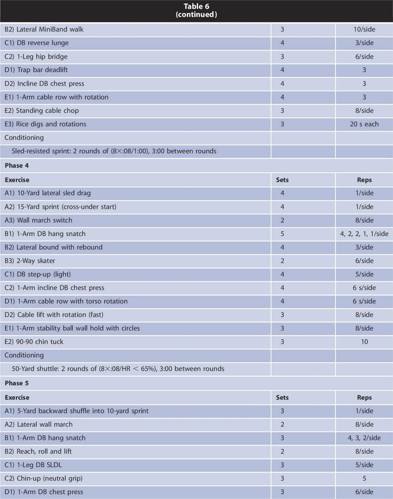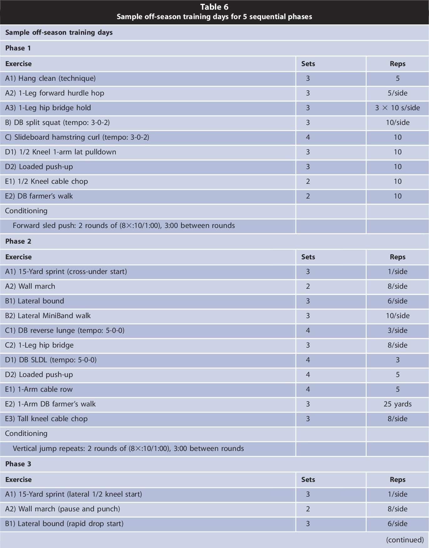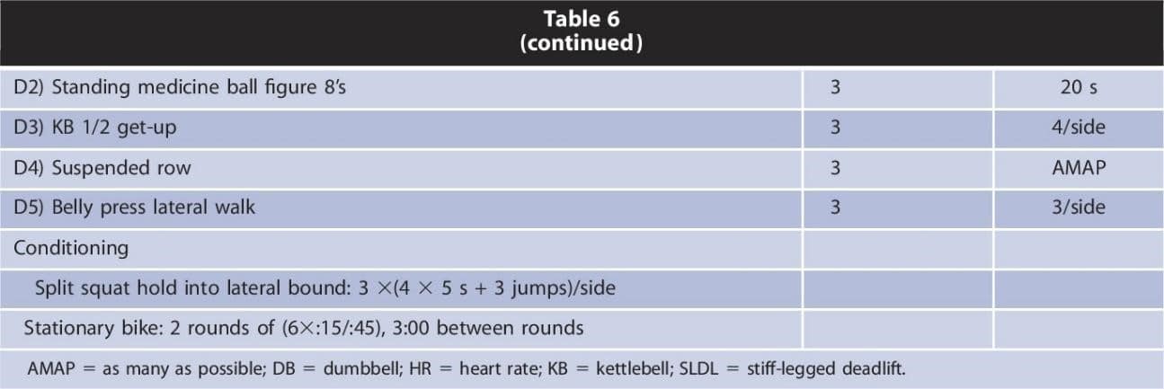 En la siguiente tabla (tabla 6), el autor expone ejemplos de ejercicios realizados en cada una de las fases. Algunos de los ejercicios los hemos ido comentando a lo largo del artículo, y otros como ‘slideboard hamstring curl’ o ‘DB farmer’s walk’ son opciones para trabajar la fuerza en los jugadores de hockey. Puedes ver estos y otros muchos ejercicios en la siguiente lista, y si no sabes a qué ejercicios se refieren bastará con copiarlos en el buscador de Google o YouTube para ver su ejecución.