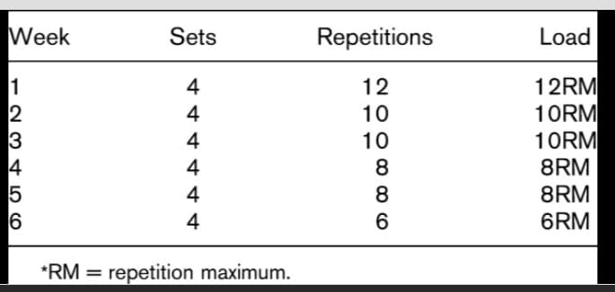 • 7 repeticiones al 70% de la repetición máxima (RM)