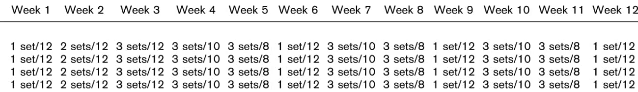 Esta intervención tuvo el mismo volumen de entrenamiento para todos los grupos. Es curioso que hayan utilizado el mismo volumen de entrenamiento cuando las cargas no son las mismas para cada ejercicio ni para cada método de entrenamiento. A continuación, detallamos el tipo de planificación seguida por los participantes: