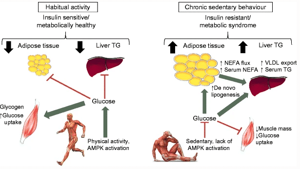 La disminución de la sensibilidad a la insulina con la inactividad física no está directamente relacionada con los cambios en la composición corporal (pérdida de masa muscular, aumento del porcentaje de grasa corporal) ya que la misma se desarrolla rápidamente (en unos pocos días) y mucho antes de que se establezca una atrofia muscular y/o aumento de la grasa corporal (o deposición de grasa ectópica) 109. Paralelamente, y posiblemente relacionado con la resistencia a la insulina inducida por la inactividad, está la elevada carga inflamatoria que puede ocurrir con el reposo prolongado 108.