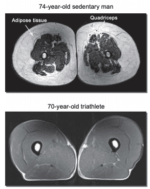 Figura 9 Resonancia magnética nuclear mostrando diferencias en el tejido adiposo subcutáneo entre un hombre de 74 años sedentario vs un triatleta de 70 años93