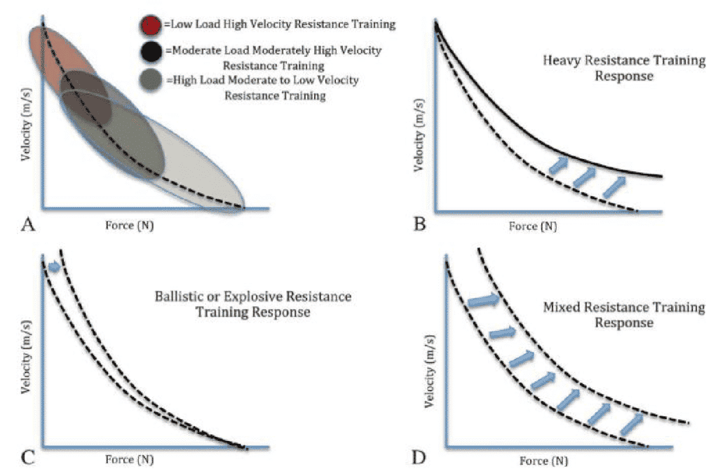 En esta figura, se puede observar cómo puede variar la curvatura dependiendo de la zona de entrenamiento en la que se ha dado prioridad según la disciplina deportiva y los requerimientos de ésta. Si se entrena con cargas elevadas (>80%1RM) se producirán mayores mejoras en la zona de velocidad baja y fuerzas altas.