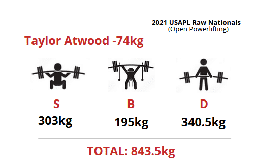 Taylor Atwood es un powerlifter de estadounidense de 33 años, 2 veces campeón del mundo de la IPF en categoría -74kg. En su penúltima actuación, en los USAPL Raw Nationals en Florida, hizo ocho de nueve y llegó a un increíble total de 838.5 kilos, es decir, prácticamente 11 veces su propio peso corporal. Atwood estableció los récords estadounidenses de sentadilla, peso muerto y total y aunque posee ahora los cuatro récords en -74 kilos, dado que la USAPL es una organización nacional, un levantador no puede establecer récords mundiales en este encuentro. Sin embargo, el nuevo total de Atwood es el más pesado de todos los tiempos con 74kg (según Open Powerlifting).