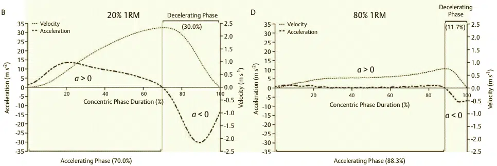 En la mayoría de los ejercicios de fuerza, el movimiento comienza a partir de la velocidad cero, alcanza la velocidad máxima en algún momento intermedio dentro de la parte concéntrica del levantamiento y, finalmente, vuelve de nuevo a la velocidad cero. Así, una parte considerable de la fase concéntrica se dedica a desacelerar la carga, especialmente con cargas ligeras (<50/60% 1RM) y medias (60-75/80% 1RM) 8. Esta aceleración negativa (desaceleración) parece ser mayor de lo que se esperaría debido únicamente al efecto de la gravedad y se debe a la fuerza del atleta aplicada en la dirección opuesta al movimiento. Como resultado, la fuerza aplicada por el atleta contra la carga externa es negativa y desde un punto de vista cinemático el movimiento puede ser subdividido en una fase de ‘ propulsión ‘ ( F > 0) y una fase de ‘ frenado ‘ ( F < 0) 8.