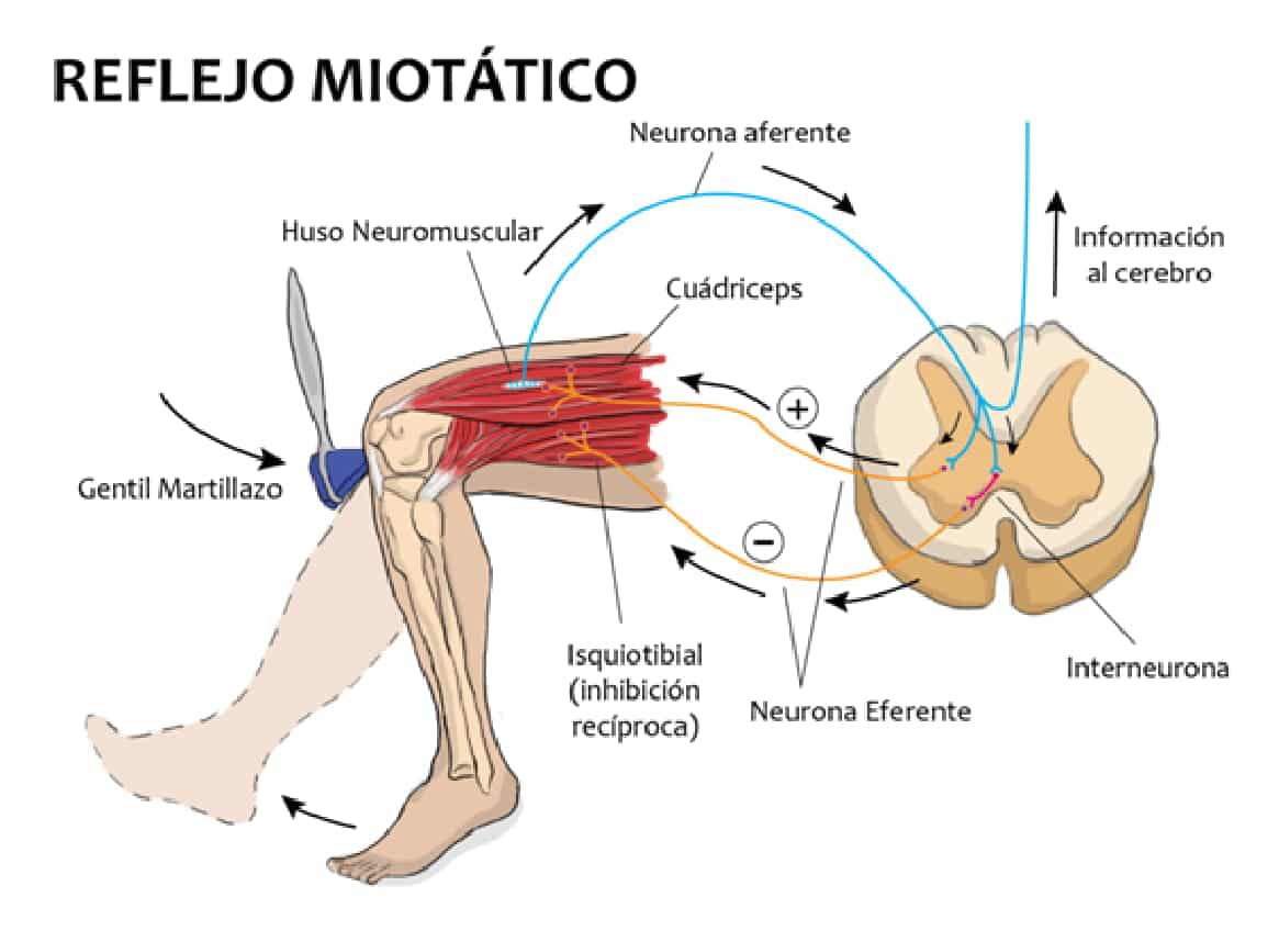 Nous avons déjà commenté que le résultat du réflexe myotatique est une contraction involontaire des muscles. Cependant, ce réflexe myotatique a différentes magnitudes. Ainsi, par exemple, lorsqu’un marteau neurologique est utilisé et que le genou est frappé, le réflexe myotatique offre une réponse d’une grande amplitude car le résultat est une extension presque complète du genou. Lorsque nous amenons la main à une bougie et que nous la brûlons, la contraction n’est pas seulement d’un groupe musculaire, mais les muscles de la main, du bras, de l’épaule et même du dos sont activés. C’est-à-dire que le réflexe myotatique affecte différents groupes musculaires de la même manière et avec une grande amplitude. Et, à l’inverse, lorsque nous effectuons une étirement, le réflexe myotatique ne contracte que le muscle pour qu’il ne puisse pas continuer à s’étirer.