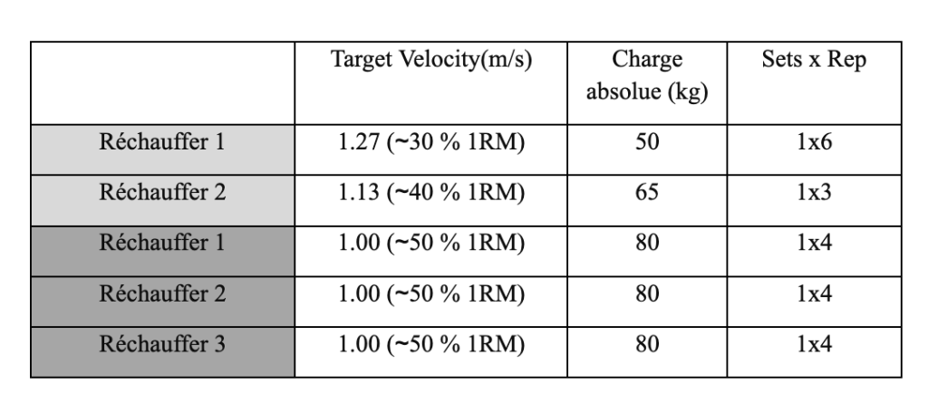 Des séries d’échauffement peuvent être utilisées pour déterminer la vitesse du mouvement et ajuster les charges avant les séries principales, comme le confirment des études précédentes (Pareja-Blanco et al., 2020a ; 2020b). Par exemple :