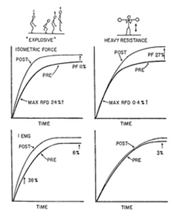 Dopo un blocco di allenamento massimale, la RFD è influenzata negativamente nei suoi primi momenti, producendo una depressione dei suoi valori. Mentre dopo un blocco di allenamento per la potenza, i valori della RFD nei suoi primi momenti sono aumentati (14).