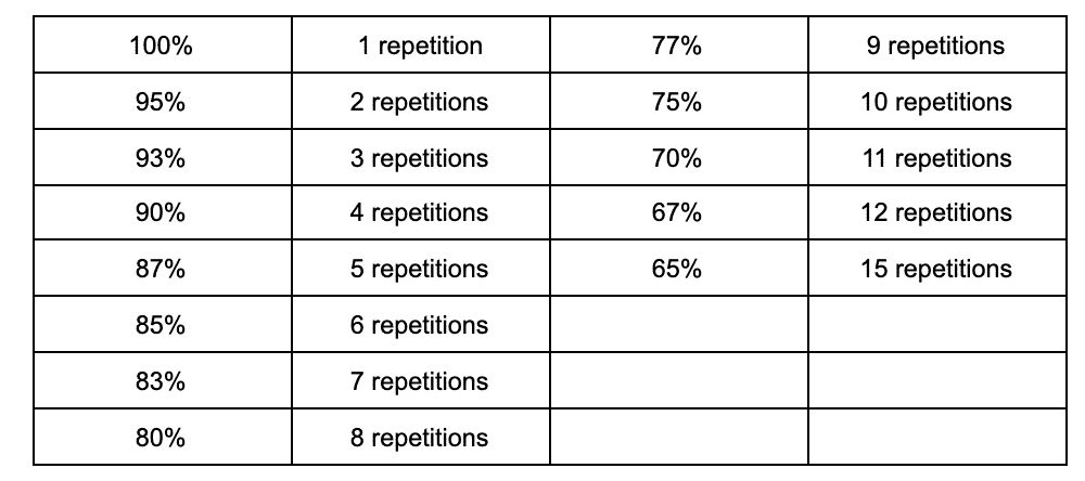 Ricorda che sollevare carichi vicini al fallimento può causare affaticamento e, questo, non solo può influire sulla raccolta dei dati, ma anche sull’allenamento successivo. Ecco una tabella di stima delle ripetizioni massime in base al% del 1 RM scelto. Ricorda che c’è una grande variabilità in termini di ripetizioni massime associate a una percentuale di 1 RM. (23)