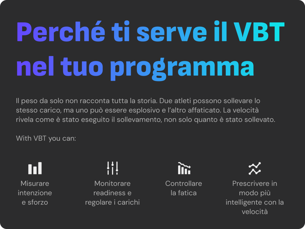 “È un ottimo dispositivo quando si allenano molti atleti e si deve iniziare e continuare a lavorare spediti. Il VBT è fondamentale perché mi permette di sapere in quale zona di sforzo si trovano i miei atleti”