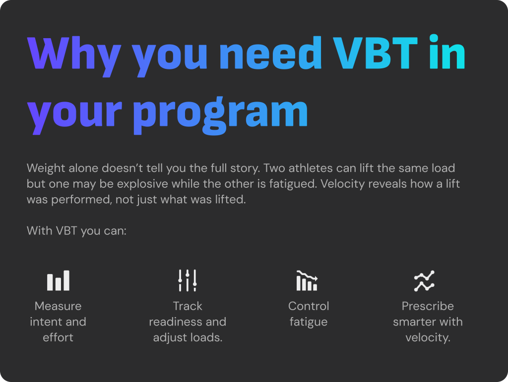 Velocity is the missing piece in strength training. It shows you what the bar speed is telling you, whether your athletes are ready to perform, fatigued, or at risk of breaking down. By tracking bar speed and velocity loss, you move beyond just counting weight and reps. You can individualize loads daily, push when athletes are primed, and cut sets before fatigue turns into injury.